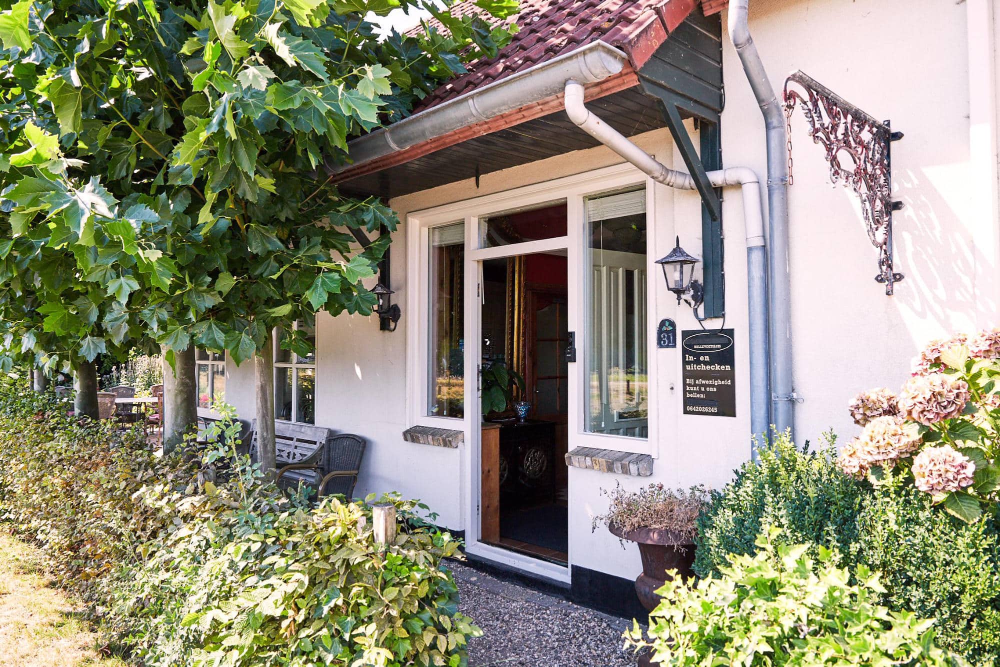 Als je je privé parkeerterrein oprijdt, omarmt je de gezellige sfeer van de rustieke woonboerderij met haar oude paardenstallen.